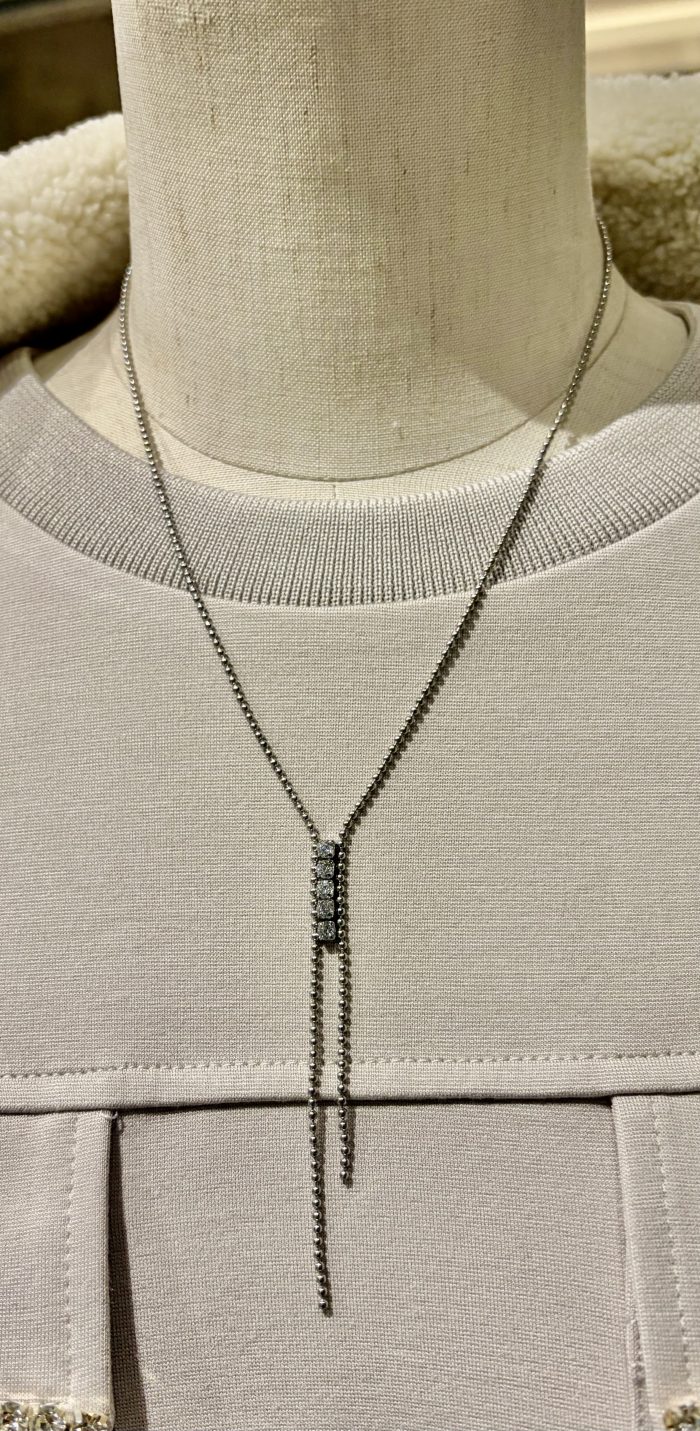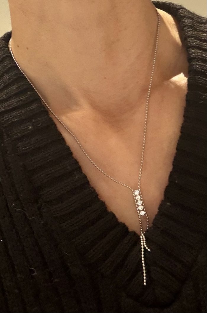 合わせたネックレスは、キラキラのビジューが美しい