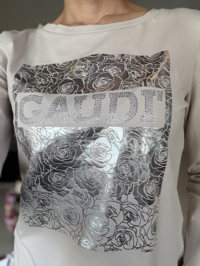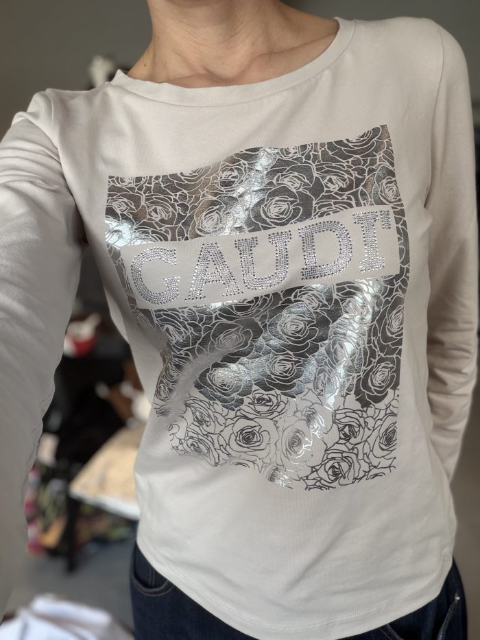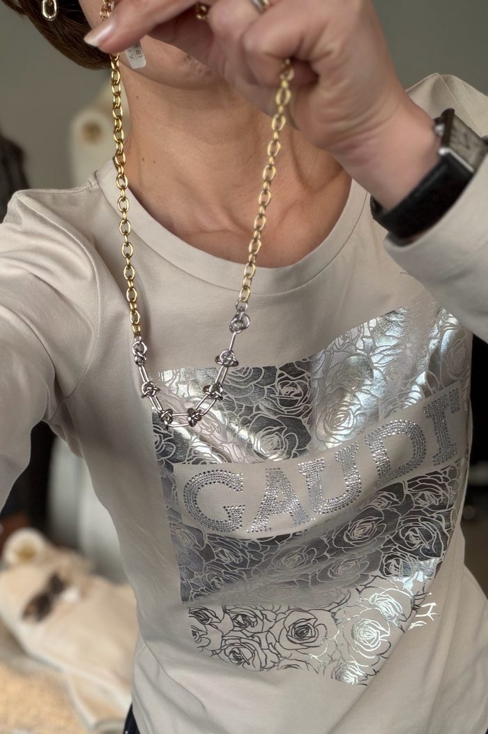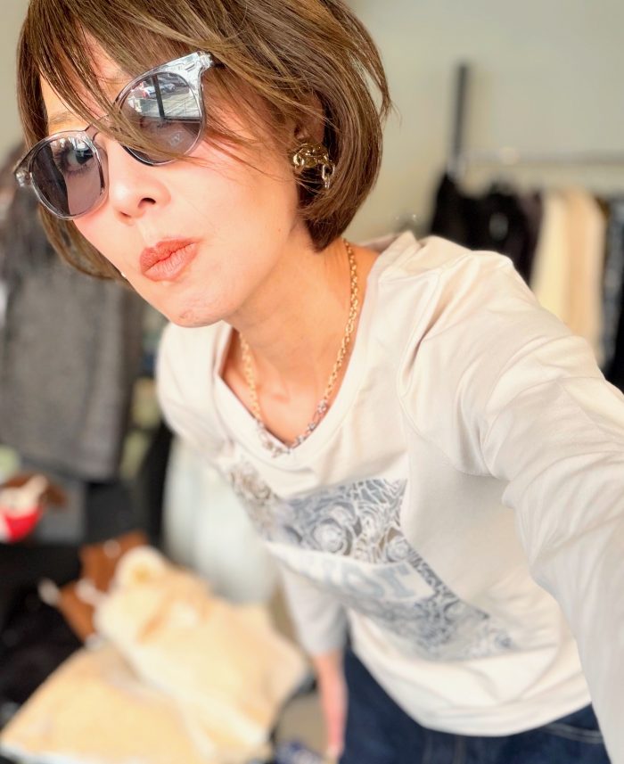 シルバーのキラキラのロゴとバラのキラキラがとても上品に馴染んでいて、1枚で絵になるTシャツです。