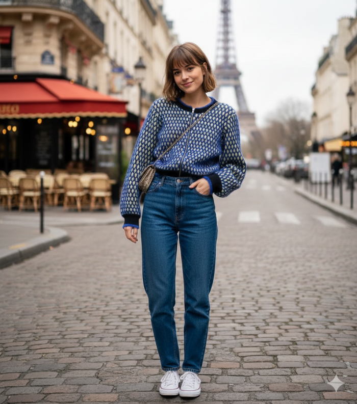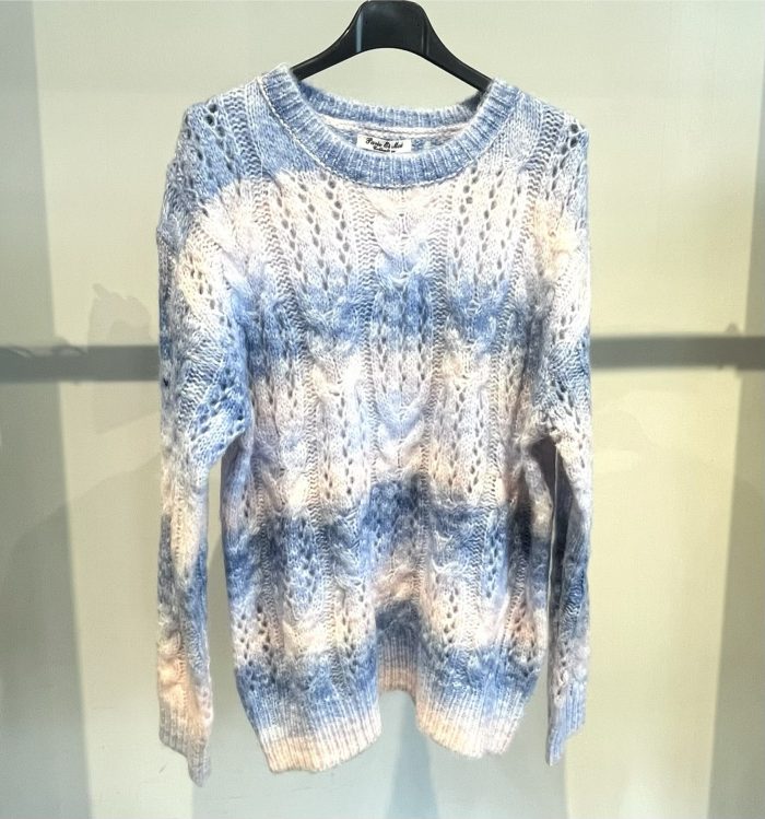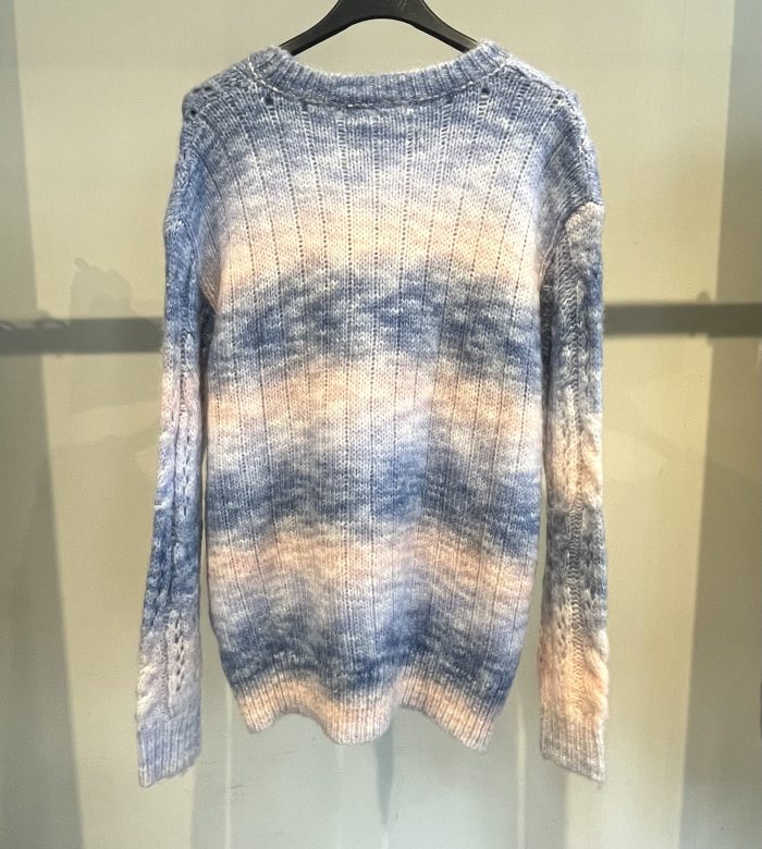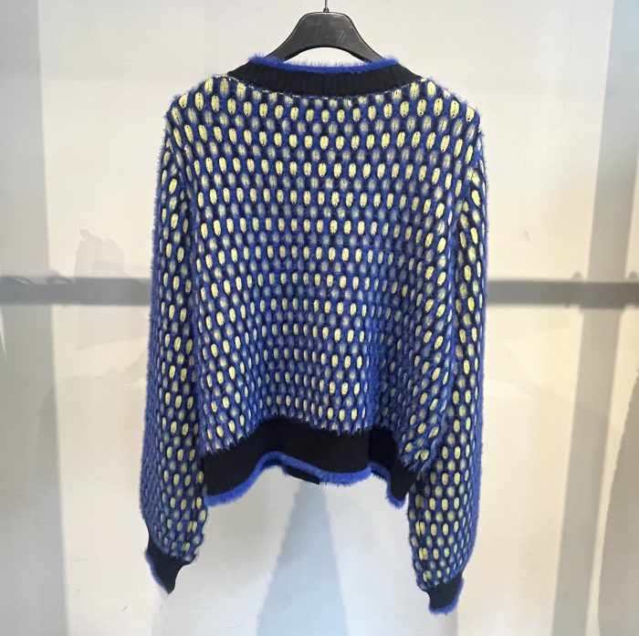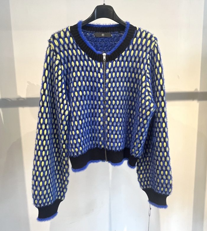 ドット柄のようなブルーとイエローのニットブルゾンです